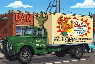 By Mario Strong As a teenager, I subscribed to several bodybuilding magazines, one of which was Dan Lurie’s Muscle Training Illustrated (MTI). Dan’s magazine was full of stories about the bodybuilding champs of the day and served as a catalog for his exercise equipment. One day, my father drove my brothers and me to Brooklyn to visit the Dan Lurie Barbell Company (see photo) on Utica Avenue. This would be the first of many such visits and the most memorable. Outside Dan’s establishment was a huge vertical sign that displayed an image of him flexing his biceps in his famous strongman pose. As we walked into the building, we became mesmerized by giant posters of past and present champions covering every square inch of wall, from floor to ceiling. Posters of Arnold Schwarzenegger, Sergio Oliva, Steve Reeves, Larry Scott, and every champion imaginable hung there before our hungry eyes. Behind the shop’s counter was Tony Badel, a local bodybuilder employed by Dan, who was occasionally